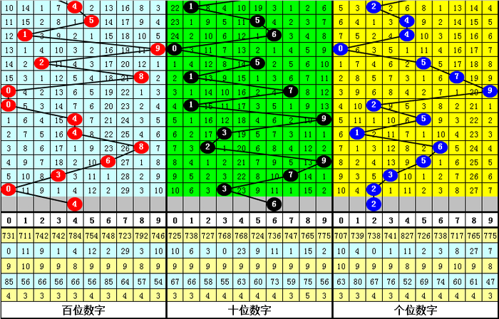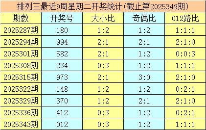 三、体彩排列三前9周星期二奖号分别开出:180-994-582-234-973-148-370-412-012,其中号码012路比为9:10:8,奇偶比为13:14,大小比为9:18;