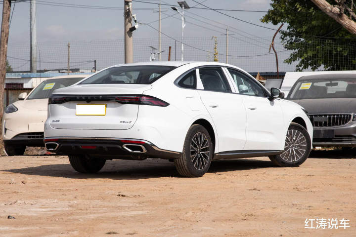 全新吉利帝豪采用时下流行的溜背轿跑风格,由于尺寸要比现款帝豪大了很多,车身轮廓看起来更加舒展,图中车型是1.5T版本,侧窗边沿应用了镀铬装饰,配备的密辐轮毂有质感,熏黑尾灯点亮后呈现上下两条红色光带,中间部分是带有“GEELY”标识的黑色饰板,形成了贯穿的样式,底部带扩散器样式的后包围和双边两出镀铬装饰口,进一步提升运动感,尾门右侧有“帝豪290T”标识,表明了身份和动力信息。