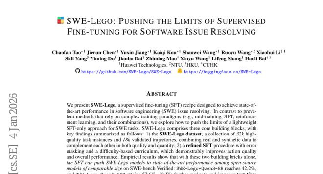 这项由华为技术有限公司、南洋理工大学、香港大学和香港中文大学联合完成的突破性研究发表于2026年1月,论文编号为arXiv:2601.01426v1。研究团队通过一种名为SWE-Lego的创新训练方法,让相对较小的8B参数模型在软件代码自动修复任务上的表现超越了许多32B甚至70B的大型模型。这就像是让一位技艺精湛的专科医生在复杂手术中战胜了经验更丰富的全科医生一样令人惊讶。