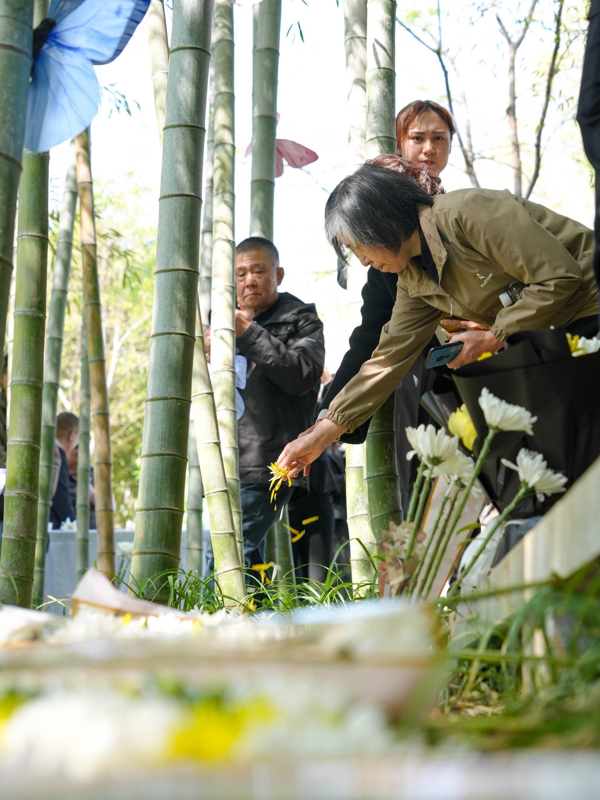 4月2日,安吉县举行竹林葬活动,逝者家属向竹林撒花。新华社发“这片竹林清幽雅致,没有喧嚣,没有压抑,亲人与青山大地相融,何尝不是另一种永生?往后我们家人,也会选择这样的安葬方式。”逝者家属董国琴对记者说。