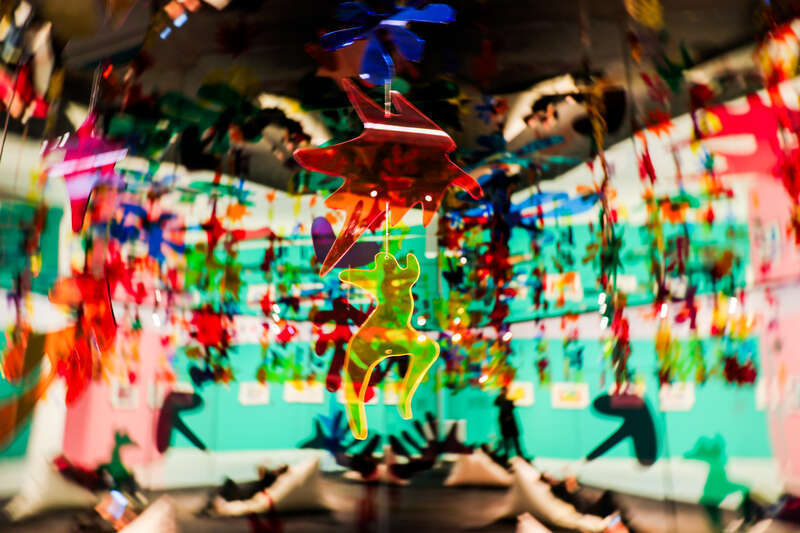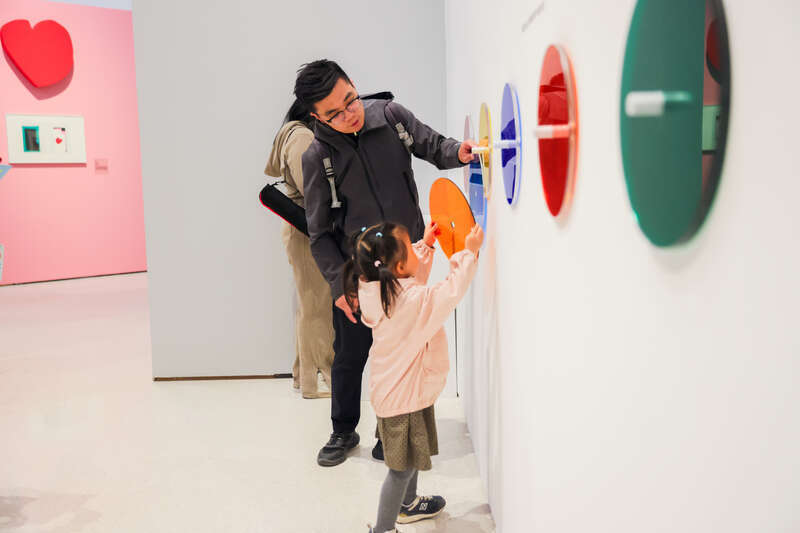 展览设置了11处沉浸式打卡点与互动体验区。在蓝白雕塑展陈旁,在《舞蹈》整墙彩色灯光装置前、在镜面安乐椅躺平区中、观众能轻松拍出“艺术大片”。