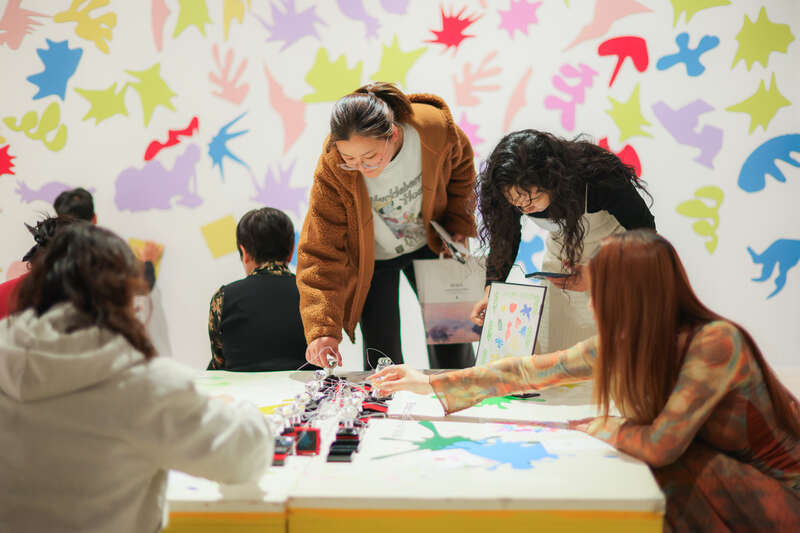展览特别设置了全龄友好的互动环节。“色彩实验室”让观众亲手玩转三原色,零基础也能轻松上手;“来自陌生人的卡片”互动区,复刻马蒂斯晚年“用剪纸卡片回应陌生人”的温柔,观众可以写下祝福投入信箱,同时带走一张陌生人的卡片,收获一份不期而遇的温柔连接。