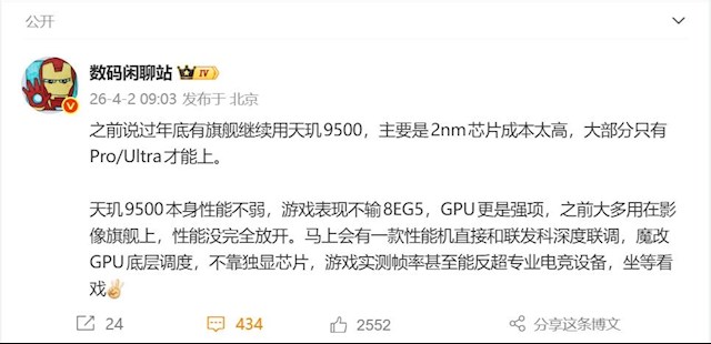 据悉,天玑9500采用了全大核架构,核心包含1个4.21GHz的超大核,以及3个旗舰级超大核和4个高性能大核。其搭载的G1-Ultra旗舰GPU,峰值性能较上一代显著提升了33%。