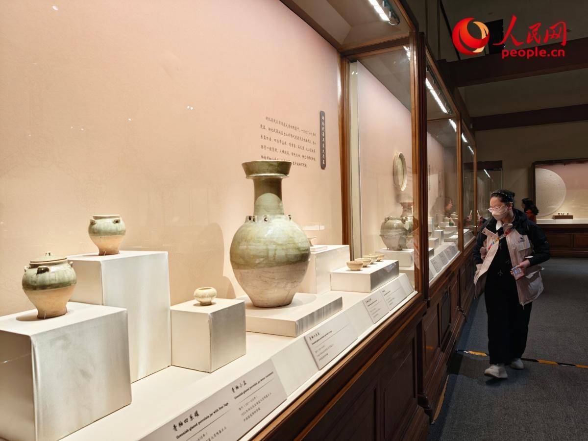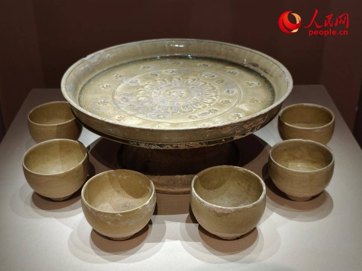 青釉刻莲花纹盘、青釉杯。人民网记者 韦衍行摄