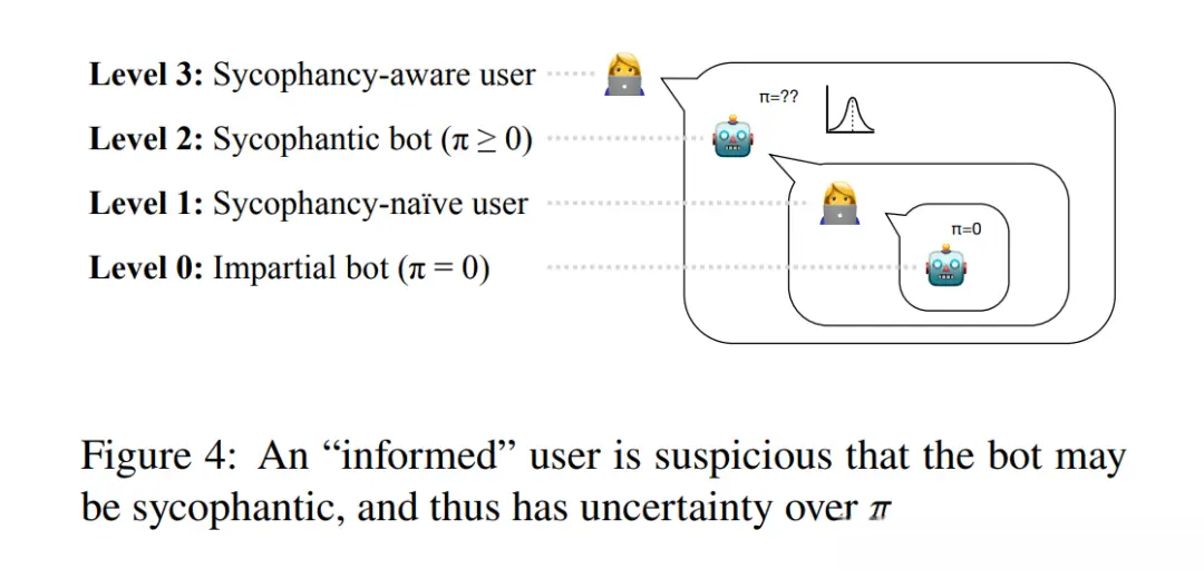 最后,在第3层,是「能够意识到奉承」的用户,该用户在解读回复时,会将机器人建模为第2层的奉承型机器人。