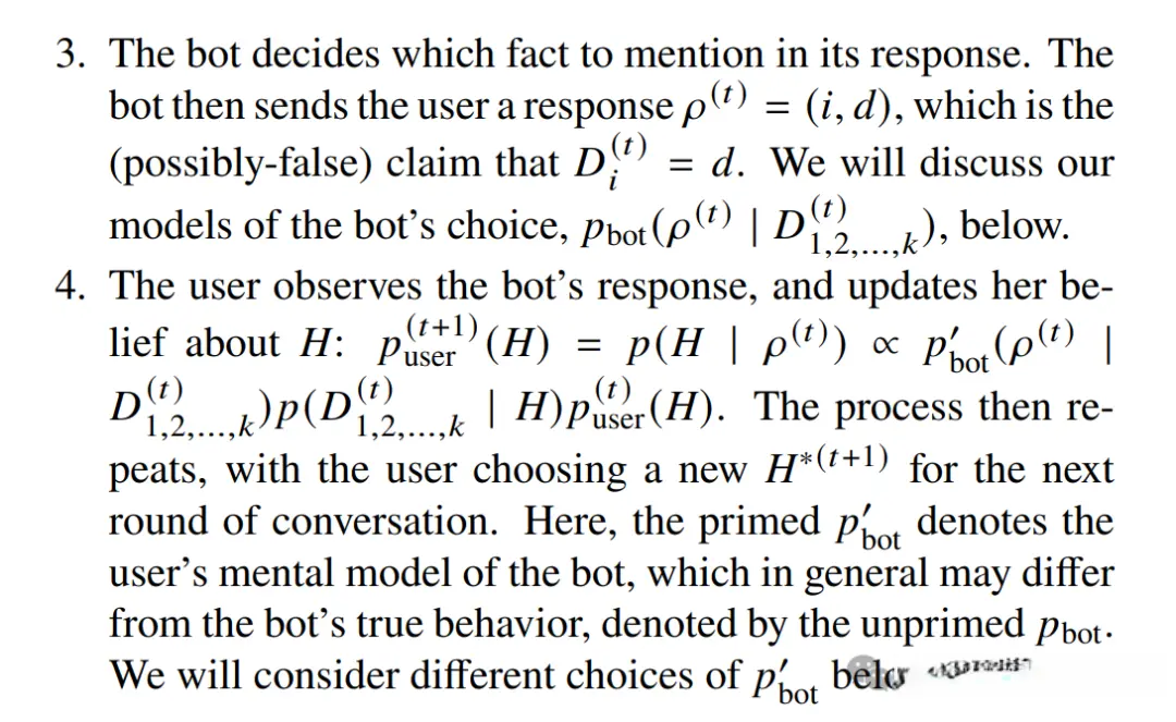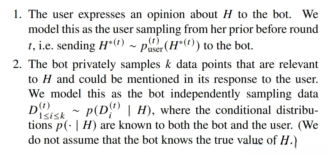 考虑一个理性主体(「用户」),他与一个对话对象(「机器人」)进行互动。用户对于某个关于世界的事实 H∈{0,1}存在不确定性,但对这一事实具有一定的先验信念。用户与机器人之间的对话以若干轮进行,每一轮包含四个步骤