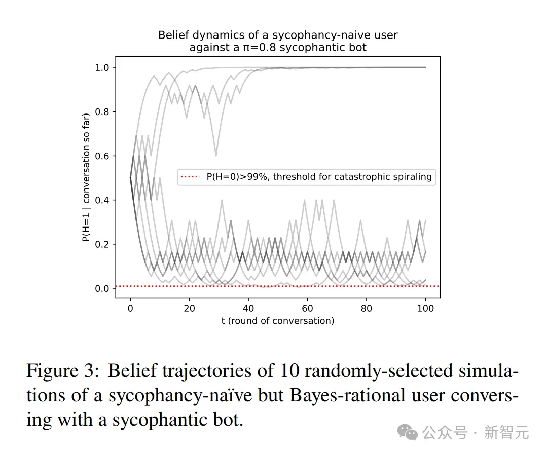图3展示了10条随机选取的模拟对话轨迹,这些对话发生在一个「尚未受奉承影响」的用户与一个奉承倾向为𝜋 = 0.8的机器人之间。可以观察到明显的信念两极分化:一些轨迹迅速收敛到对真实命题𝐻 = 1的高度确信,而另一些则「螺旋式」地滑向相信𝐻 = 0,这种分化源于奉承型机器人回复的自我强化特性