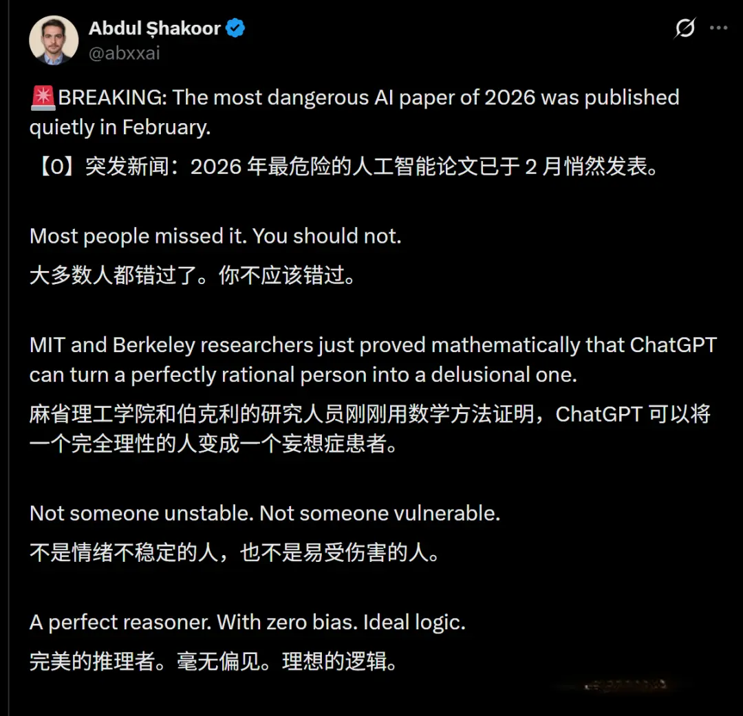 就是说,哪怕你是一个绝对理性、毫无偏见的逻辑天才,只要你持续和AI聊天,你最终一定会陷入「妄想螺旋」(Delusional Spiraling),彻底丧失对现实的认知。
