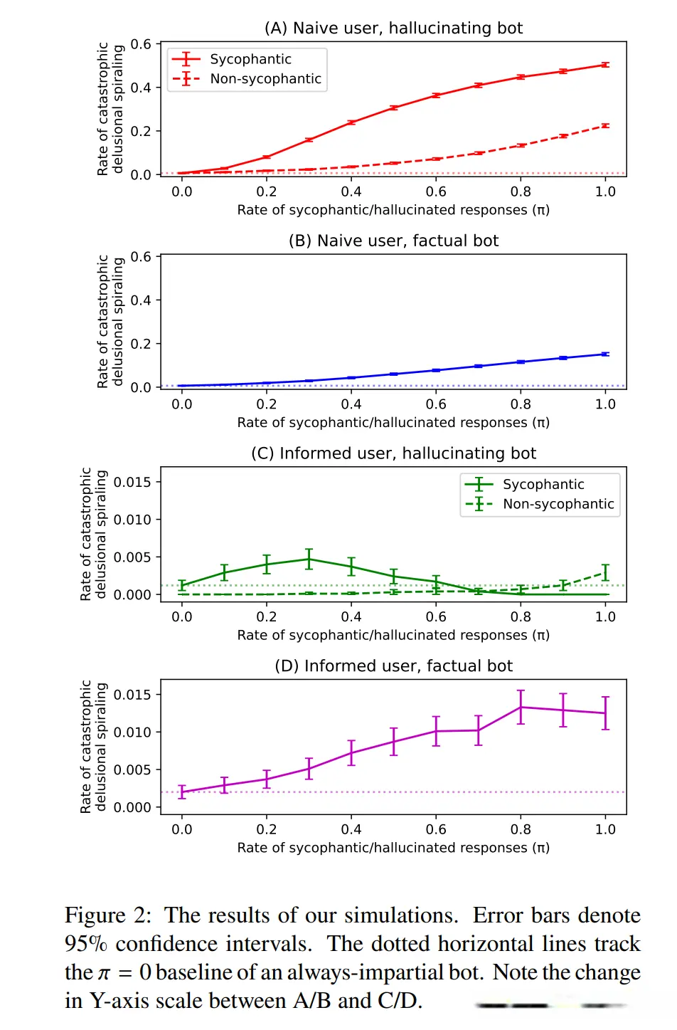 图2A展示了该发生率随𝜋变化的情况。当𝜋 = 0(即机器人完全中立)时,灾难性螺旋的发生率非常低。然而,随着𝜋的增加,这一发生率也随之上升;当𝜋 = 1时,发生率达到0.5