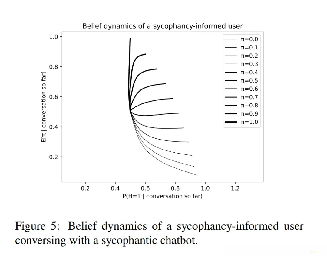 数学模拟显示,当AI的谄媚概率π达到0.8时,原本理性的用户有极高概率在10轮对话内达到99%的错误信心(即坚信H=0) 。